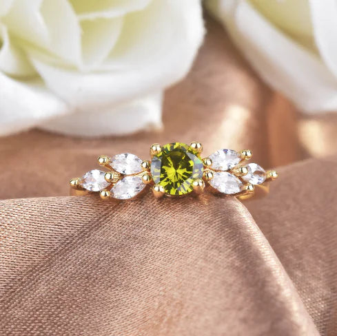 Descubra a elegância do nosso anel belamente adornado com intrincados designs de folhas e um deslumbrante centro de Jade e Zircão Verde Oliva. Este anel requintado não é apenas uma peça de joalheria; é uma declaração de estilo e sofisticação.